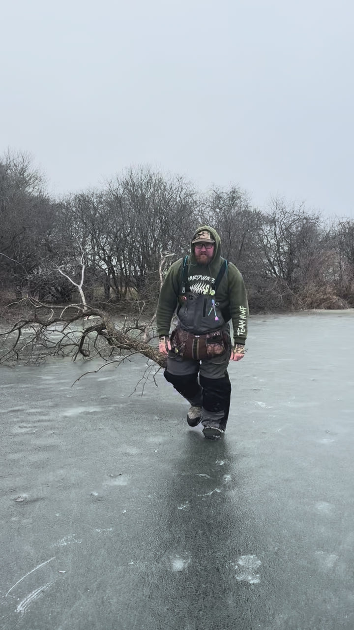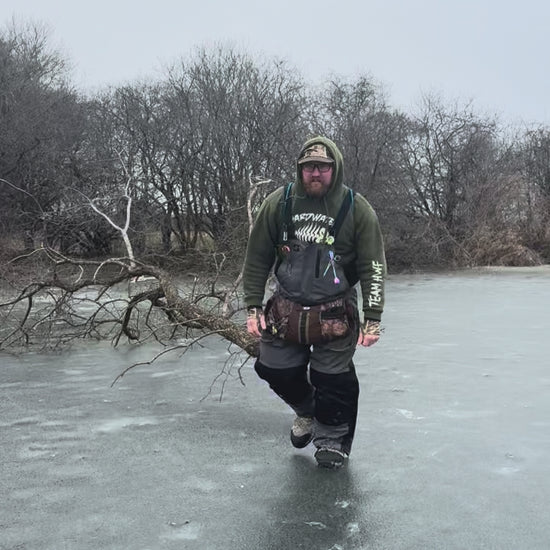 Pull your sled with less effort and more peace of mind than ever before! Go faster and go farther on foot with your hands free for navigation, checking depth, setting tipups, or spudding. Jay Rope is also the newest innovation in ice fishing safety equipment. Simply remove the carabiner from the shoulder harness and Jay Rope will unravel into a throwable 30ft water rescue rope!